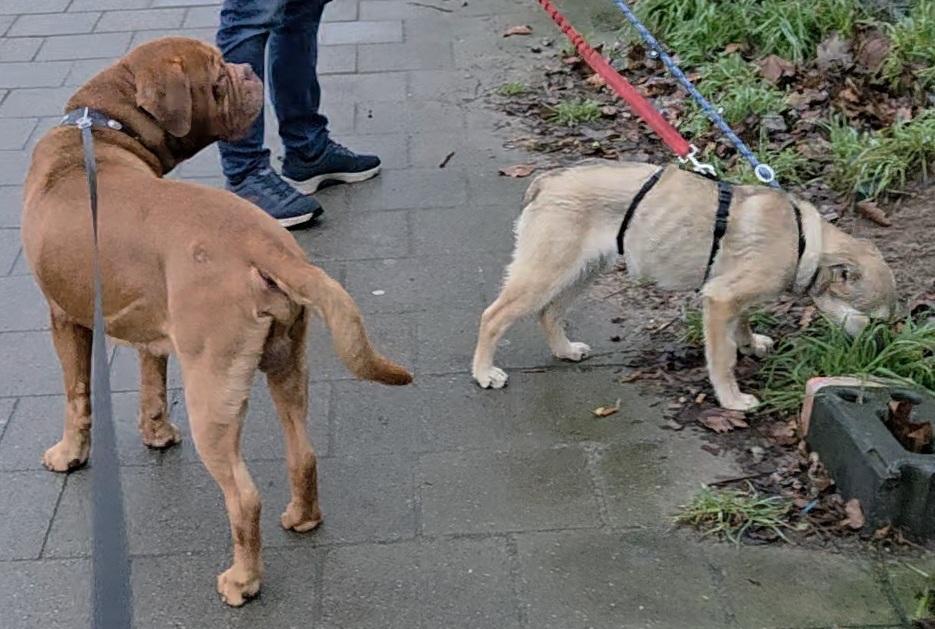 Met honden en de katten gaat 't prima. Ze is dus al een goed opgevoede pup inmiddels.