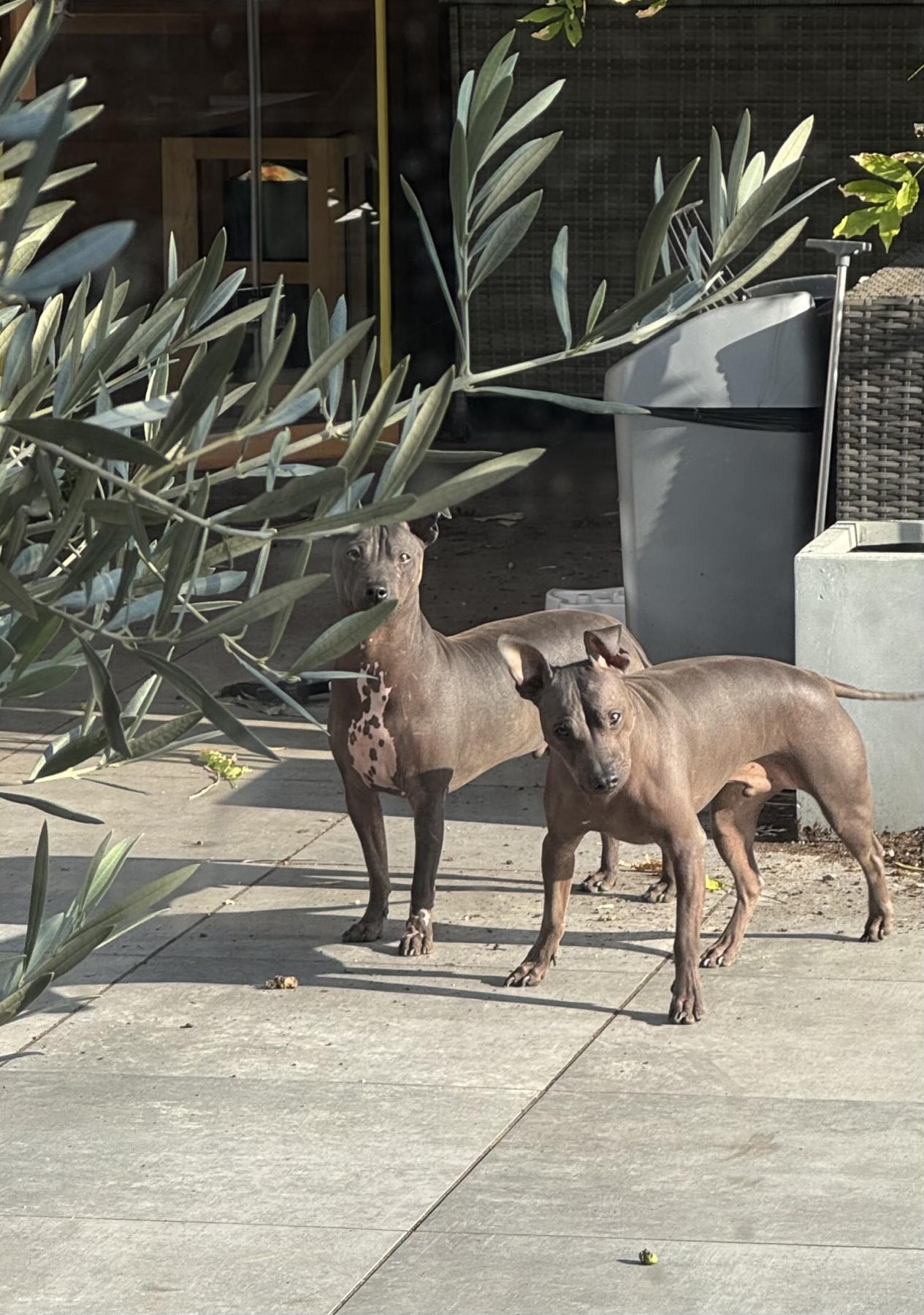 Wij zijn Amerikaanse naakthonden Jacky en Joey 2 broers van 2 jaar oud. Wij zijn opgegroeid met 3 kinderen en 2 reutjes van 16 jaar oud. Maar helaas zijn wij nu een samengesteld gezin geworden met 5 kinderen en nog een hondje er bij. En dit gaat hel