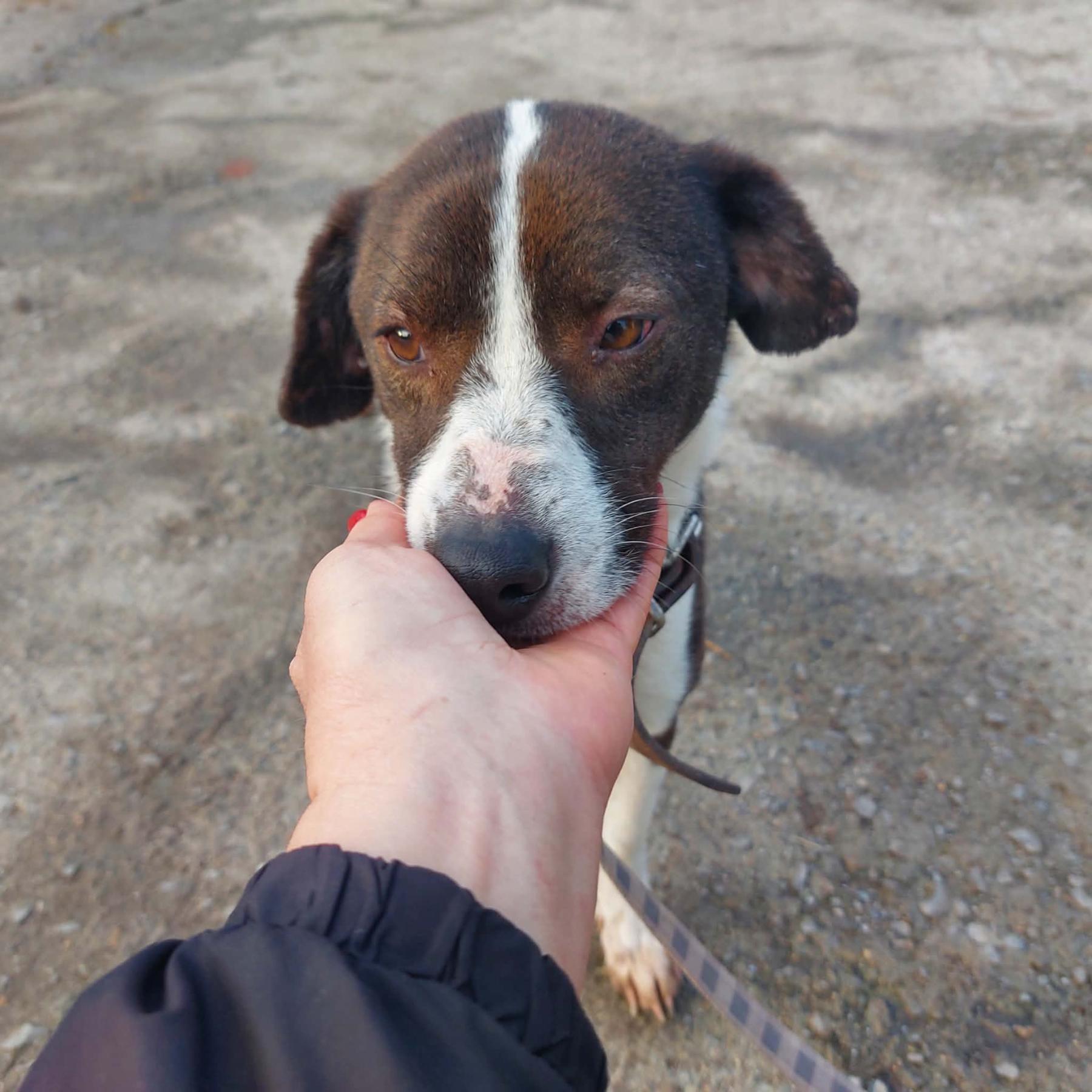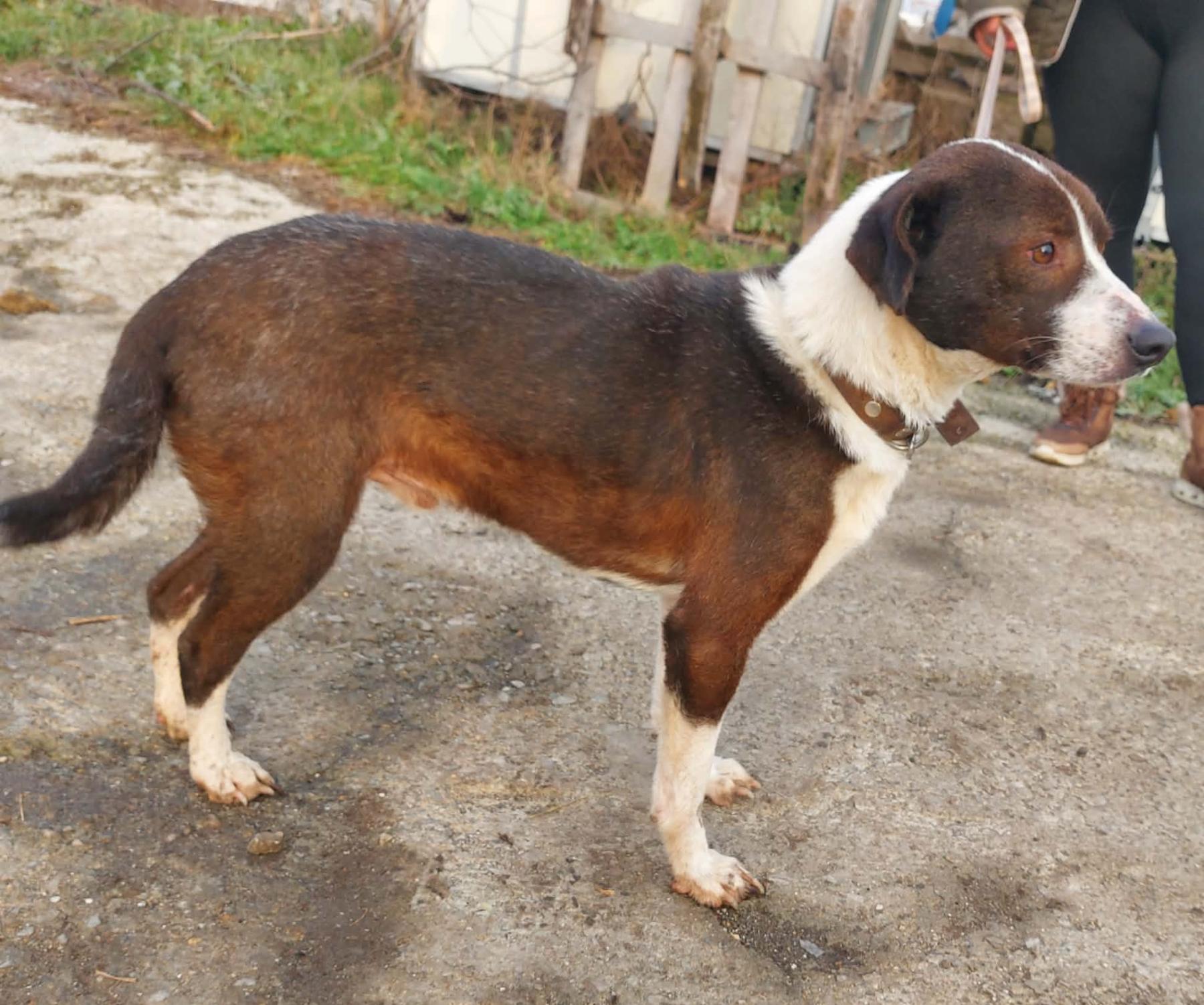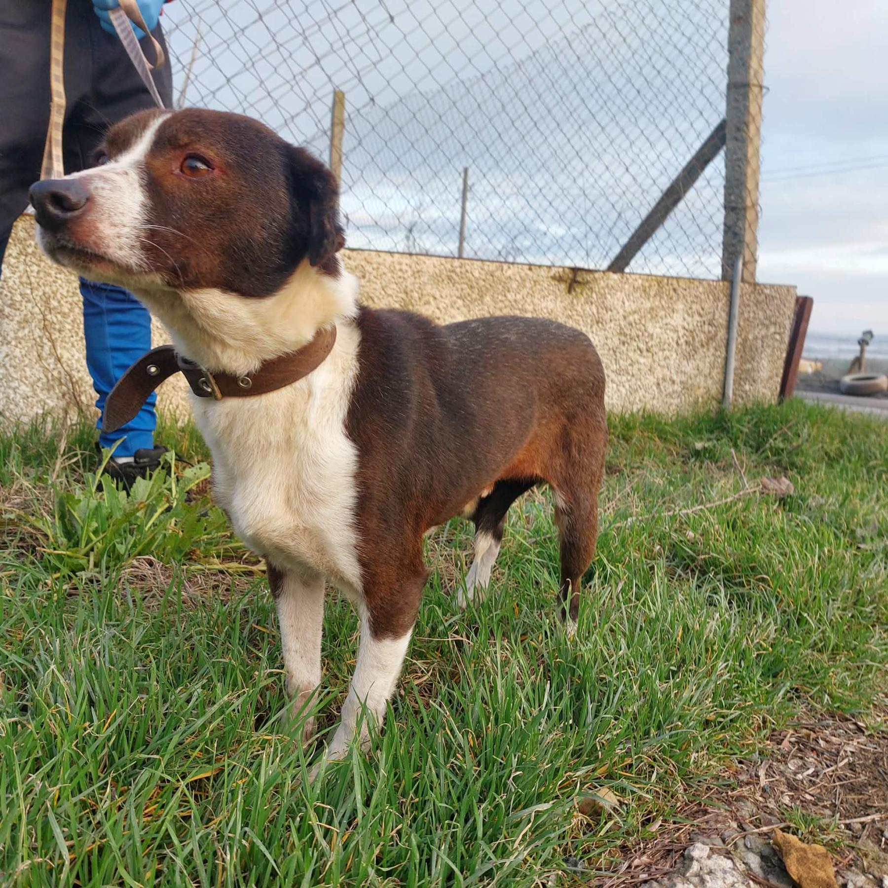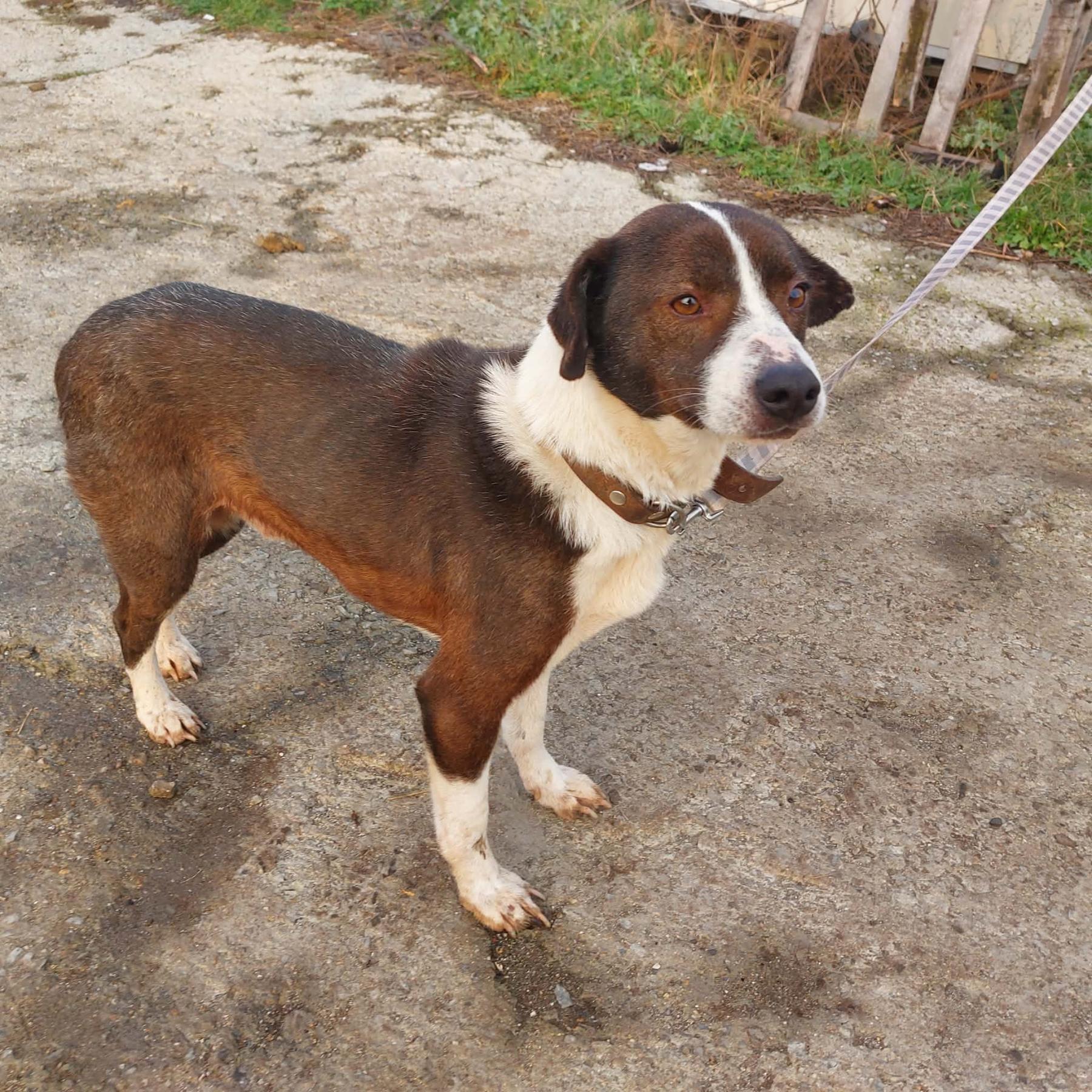 Hij werd op de weg gevonden, aangereden door een auto. De mensen die hem vonden, brachten hem naar het asiel. Hij is geopereerd – een heupresectie. Het gaat nu goed met hem. De operatie werd uitgevoerd door professoren van de universitaire veterinaire kliniek.