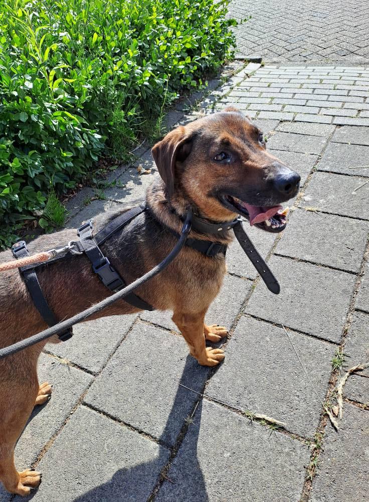 Bulgaarse voormalig kettinghond. Heeft 7 jaar (zijn hele leven) aan een korte ketting in de blubber gestaan. Hij doet het geweldig goed als huishond. Is zeer rustig, stil en prettig in huis. n