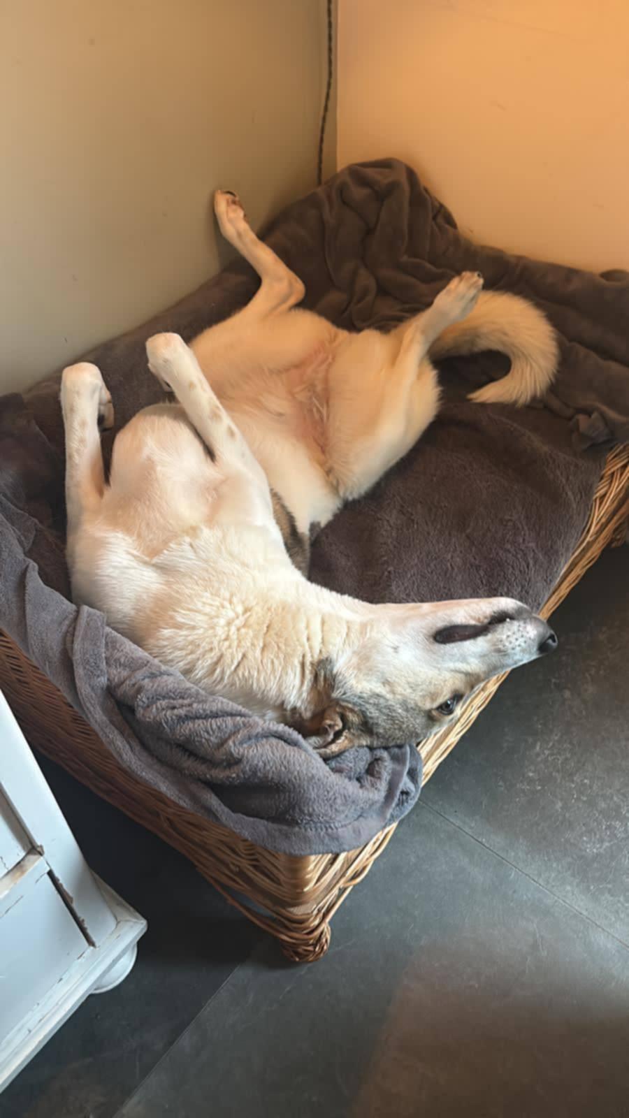 Ze kan ongeveer 4 uur alleen zijn, loopt netjes aan de lijn en trekt niet. Los spelen met andere honden gaat goed, maar haar terugroepcommando moet nog verder worden opgebouwd. Soms kan ze een beetje eigenwijs zijn. Ze gaat mee in de auto en springt zelf in de achterbak, al vindt ze het soms nog spannend.