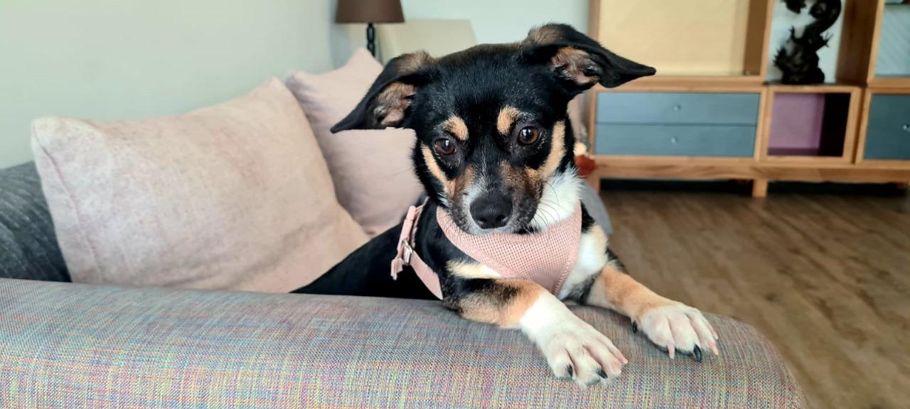 Haar vooruitgang is bewonderenswaardig: van huilend in een hoekje zitten… naar een vrolijke, dappere pup die van het leven houdt. Ze heeft nog een klein beetje opwindeningsplasje, maar ze leert snel en gebruikt haar toiletmatje al heel goed.