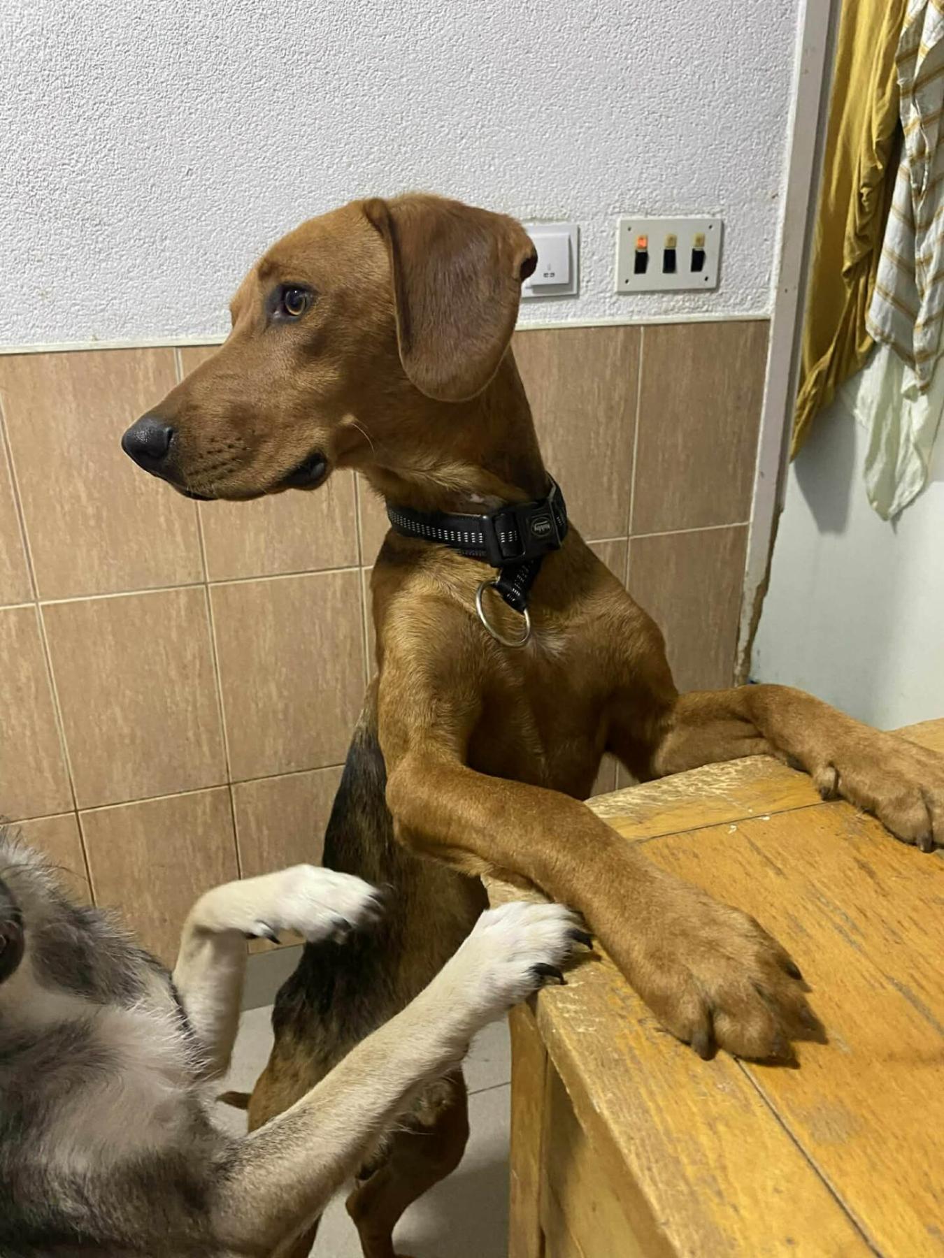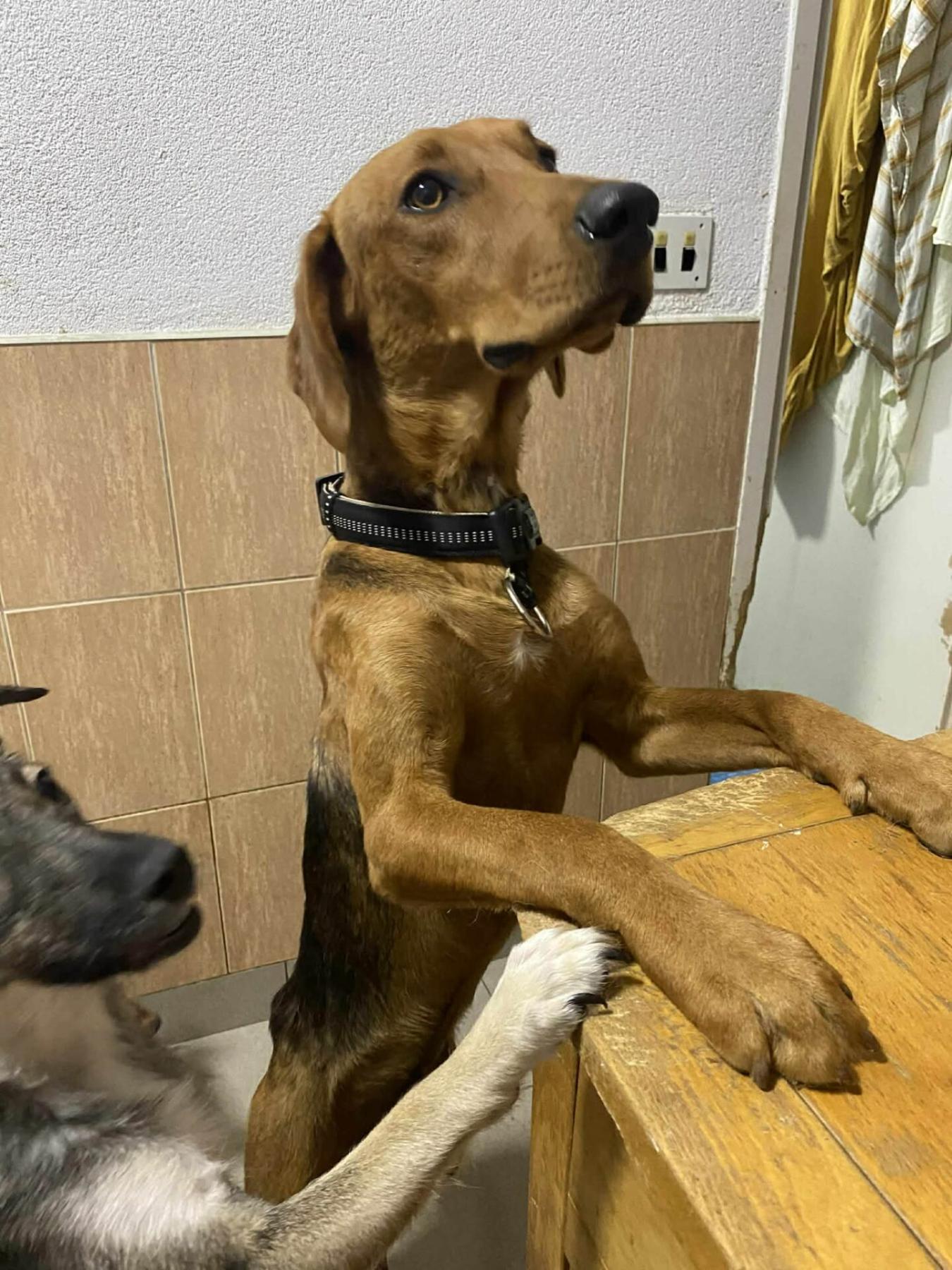 Katten zijn nog niet getest, maar Memo is van het type Posavski Hound — een ras dat doorgaans vriendelijk en sociaal is, ook tegenover katten.