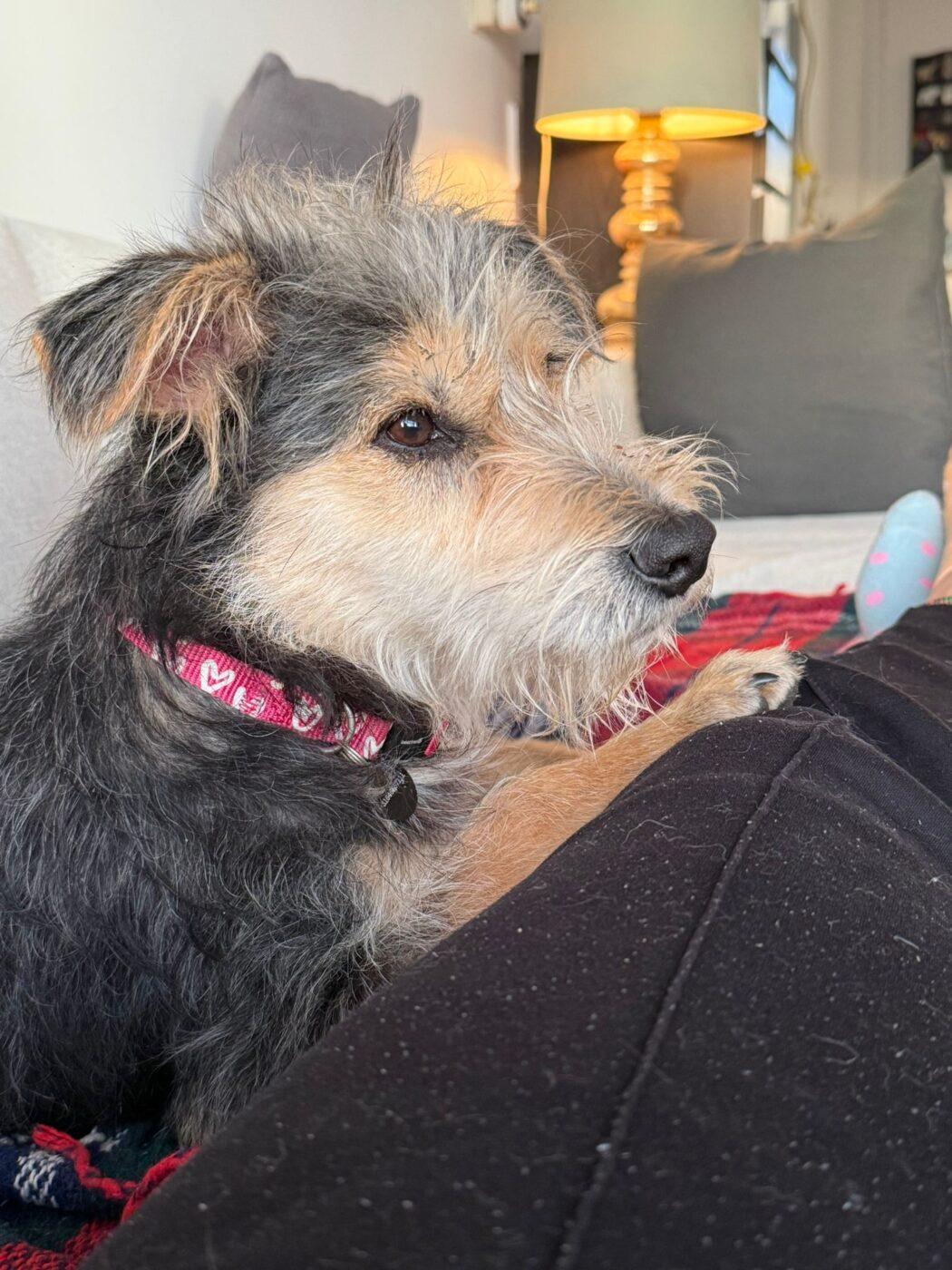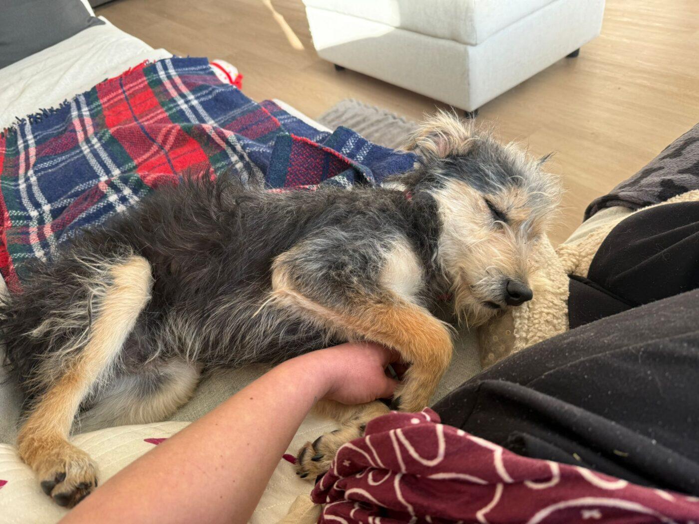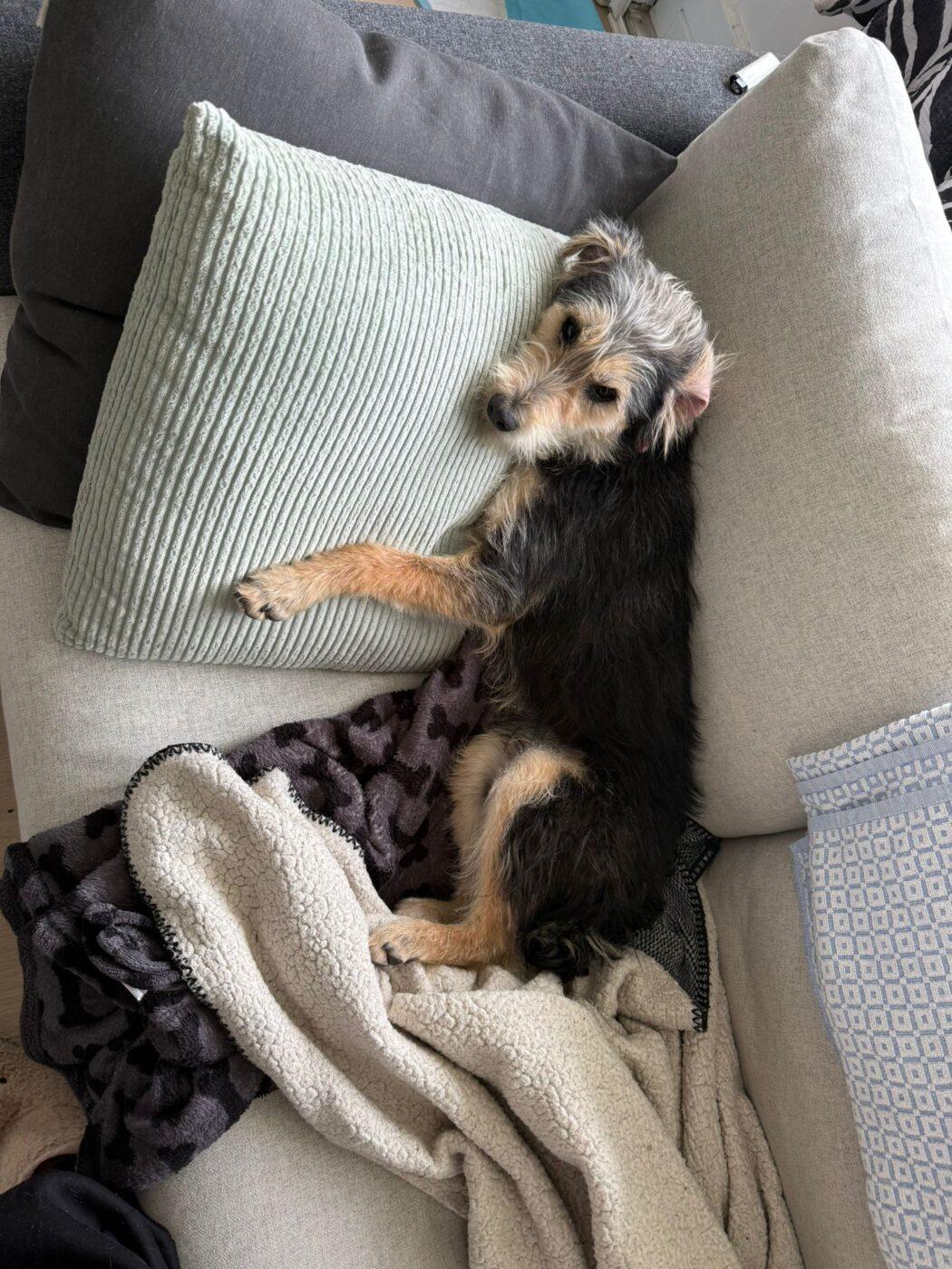 En dat doet hij. Hij ligt heerlijk in het zonnetje, speelt met een hondenvriendje die op bezoek kwam om zich daarna languit op de bank lekker te laten kroelen op zijn buikje. Mica geniet… met volle teugen. Zijn foster noemt hem; “Mica de levensgenieter”.