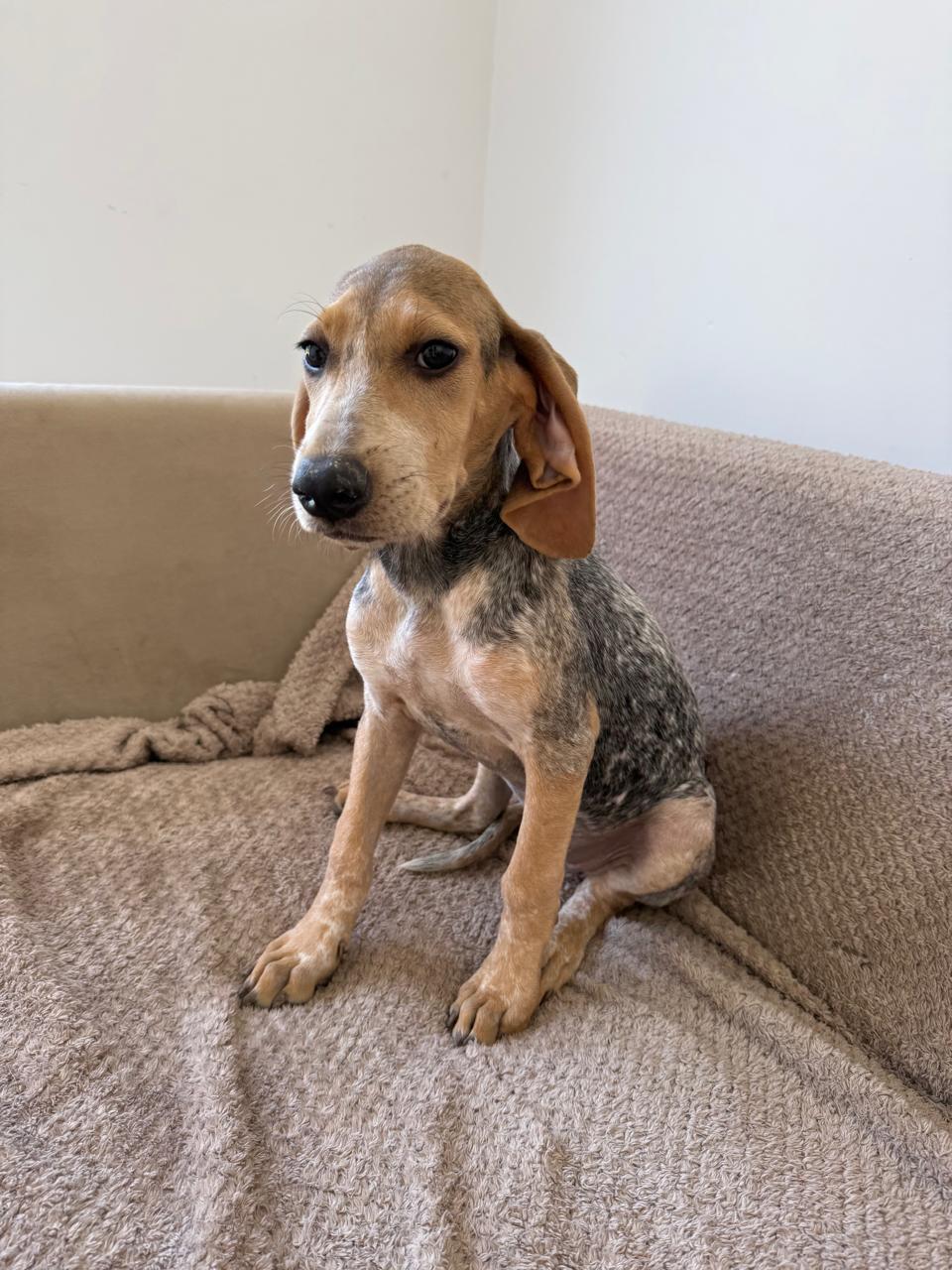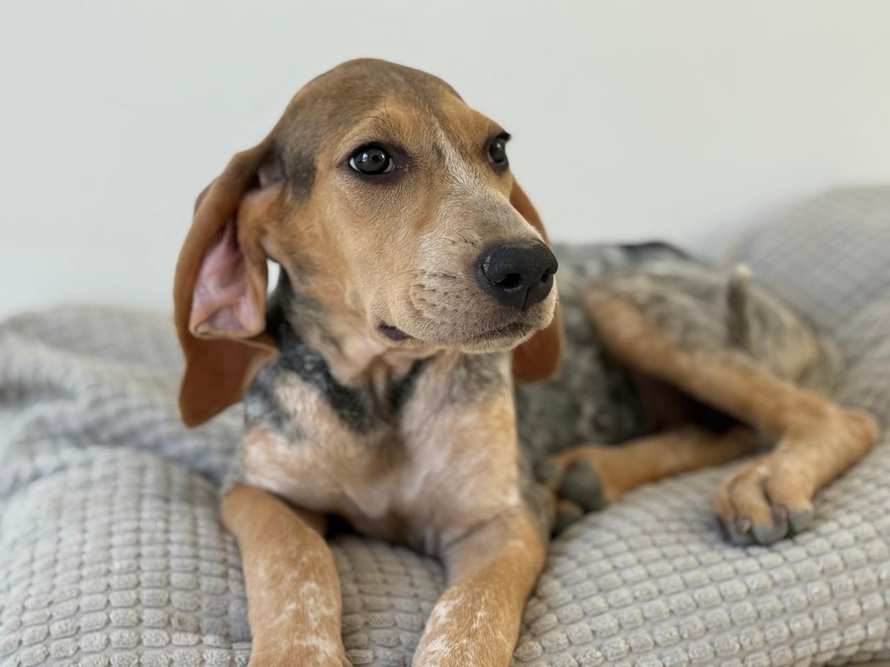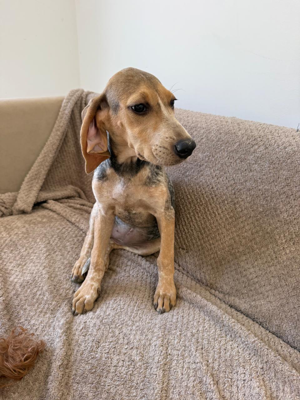 Mira heeft helaas een harde start gehad. Op amper 2,5 maanden oud werd ze gevonden langs de snelweg – bang, verzwakt, onder de vlooien en teken, en later bleek ze ook nog eens bloedarmoede te hebben. Ze verstopte zich, wilde niet gezien worden en durfde de wereld niet aan. Gelukkig kwam haar redding op tijd: een liefdevolle pleegmama die haar de kans gaf om weer te bloeien.