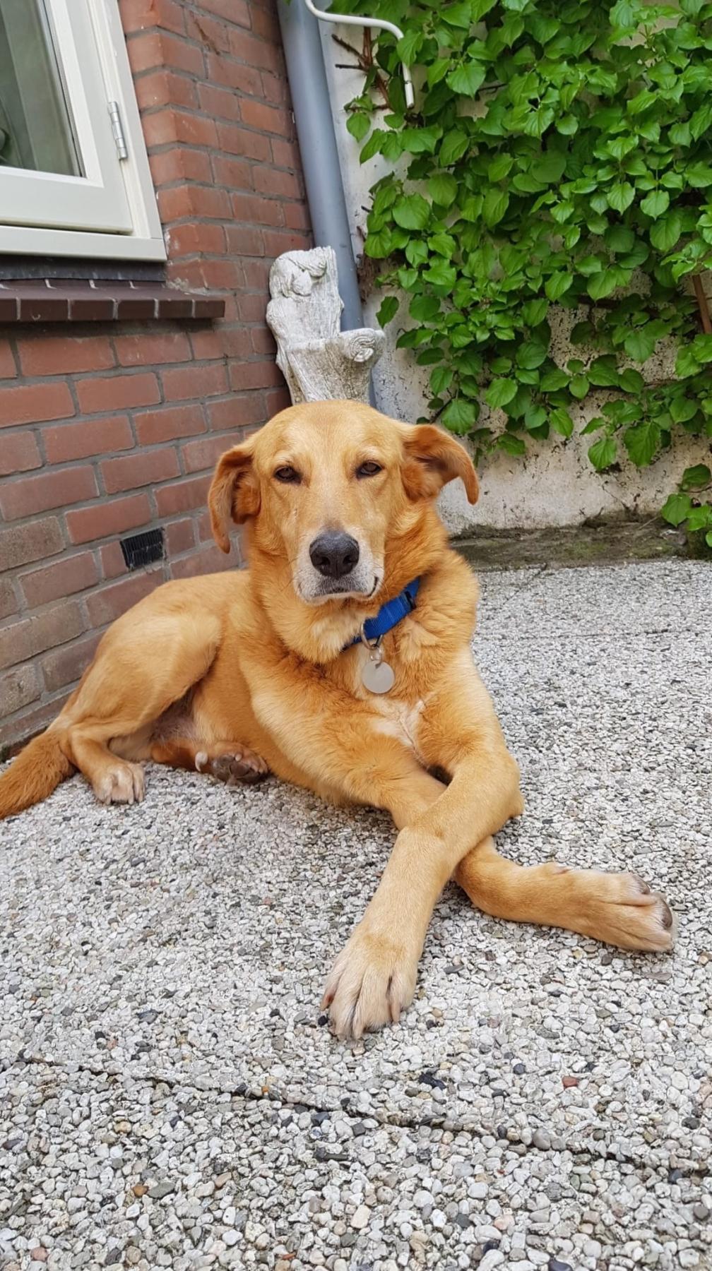 Met zijn 62 cm en 26 kg is hij groot, maar slank gebouwd. Zijn leeftijd is geschat op 6 jaar. Zeker weet je het nooit, maar onze dierenarts denkt dat het kan kloppen. Hij is in elk geval niet piepjong en zeker geen senior. Binnenkort wordt er een beschadigde kies getrokken, maar verder is hij door de dierenarts helemaal gezond verklaard.