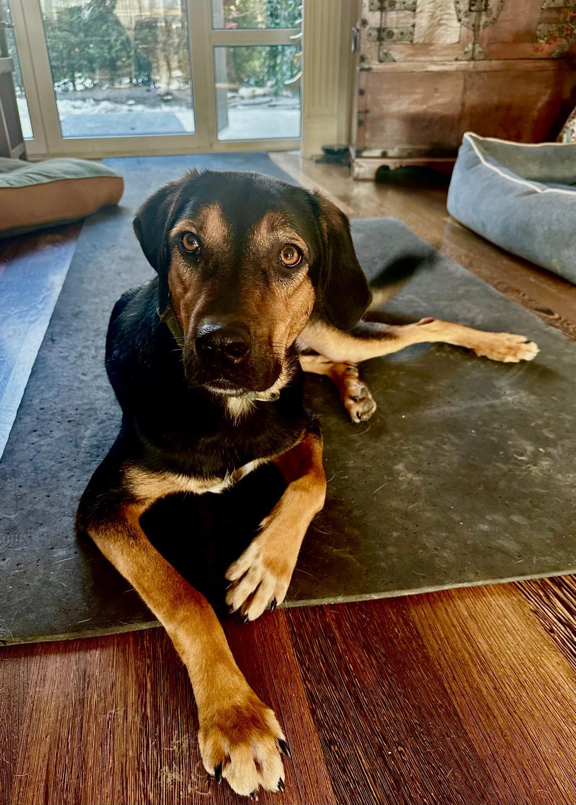 Als de kinderen zitten gaat Nora er gewoon rustig naast liggen om geaaid te worden.
