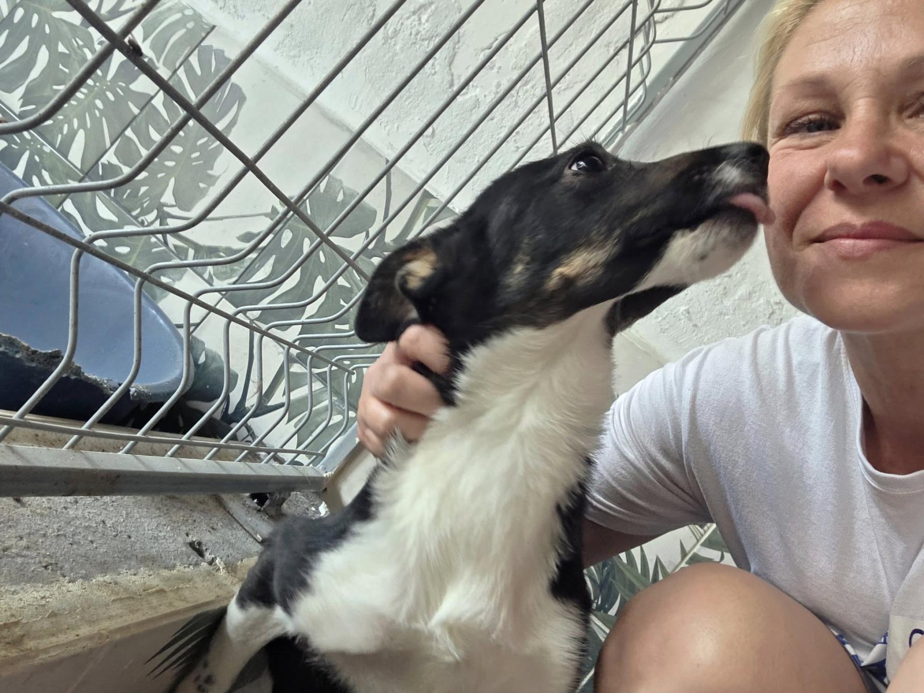 Ollie werd geboren uit een angstige, dakloze moeder. Zijn broertjes en zusjes werden geadopteerd. Hij heeft echter een "afwijking". Hij loopt gehurkt. Toen ze hem naar de dokter brachten, bleek dat hij zonder knieschijven geboren was en daarom zijn poten niet kan strekken en normaal kan lopen. Desondanks is hij een geweldige en vrolijke hond. Hij rent, springt en speelt net als iedereen. We zoeken een heel speciaal huisje voor hem.