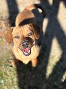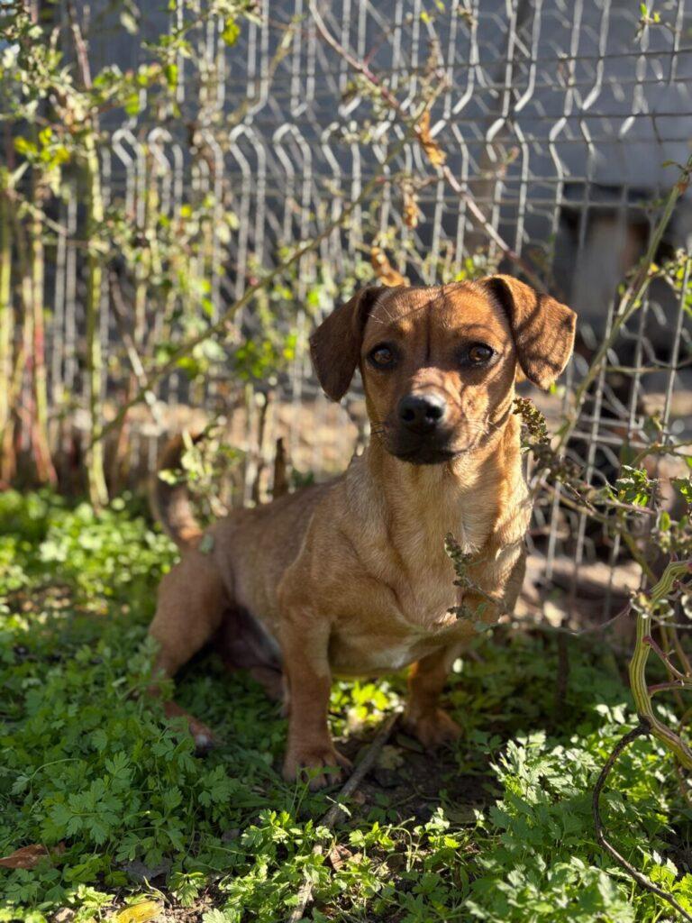 Dit vrolijke dametje is Puck, een klein teckelmix-meisje met een groot hart. Puck zwierf ooit rond op de straten van Roemenië, onopgemerkt door iedereen… tot ze gelukkig werd opgemerkt door onze rescuepartner en een plekje kreeg in de opvang.