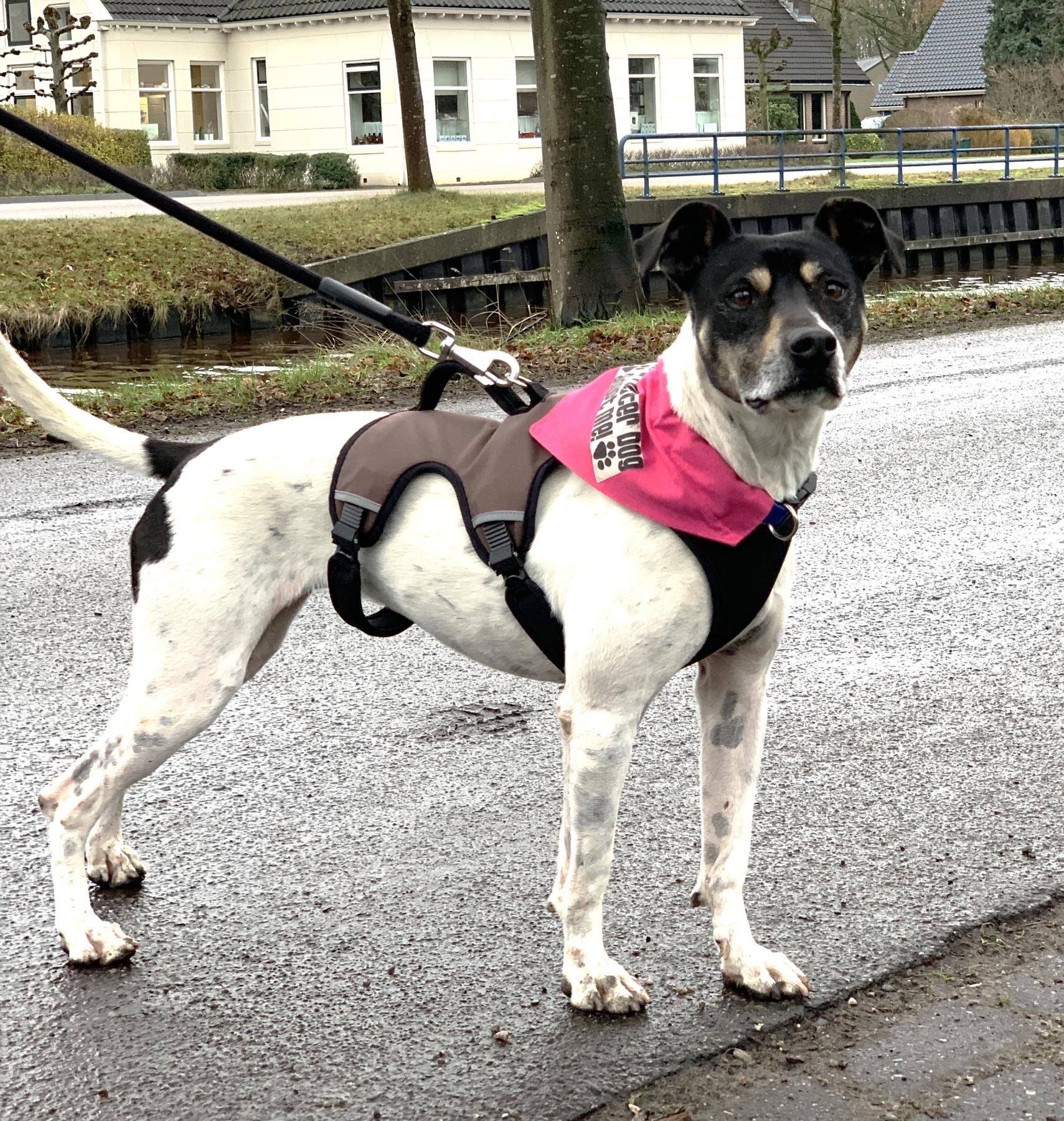 Dit powerpakket zit vol energie en zoekt sportieve baasjes. Trufa is een middelmaat van 45cm en een boerenfoksachtige mix die één en al spieren is. Ze is speels en actief maar kan ook heerlijk rustig op de bank chillen. Buiten op het terrein slaat ze snel waaks aan maar in huis is ze rustig. Hoewel ze braaf op commando gaat zitten, is ze sterk en trekt ze aan de lijn. Loslopen is nog geen optie en omdat ze graag buiten is, geven we de voorkeur aan een huis met omheinde tuin boven een appartement (ze kan wel trap lopen). Ze is niet bang voor verkeer en gaat graag mee wandelen. Ze is zindelijk, slaapt in bench de nacht door en even alleen zijn lijkt geen enkel probleem. Speeltjes zijn snel gesloopt maar ze laat meubels en spullen van het opvangvrouwtje met rust.