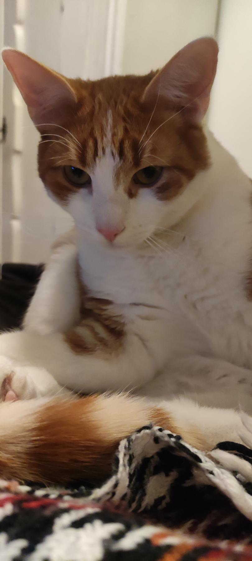 Bommel is een allemansvriendje,, knuffelt graag. Is binnen gewend maar als hij ook naar buiten zou kunnen is dat een pre. Hij is speels , als mijn kleinkinderen komen doet hij rustig naar ze, 4 en 6 jaar. Hij eet hier, is gezond gebruikt de kattenbak. Slaapt het liefst bij je. Ik noem hem ook wel eens mijn klittebandj