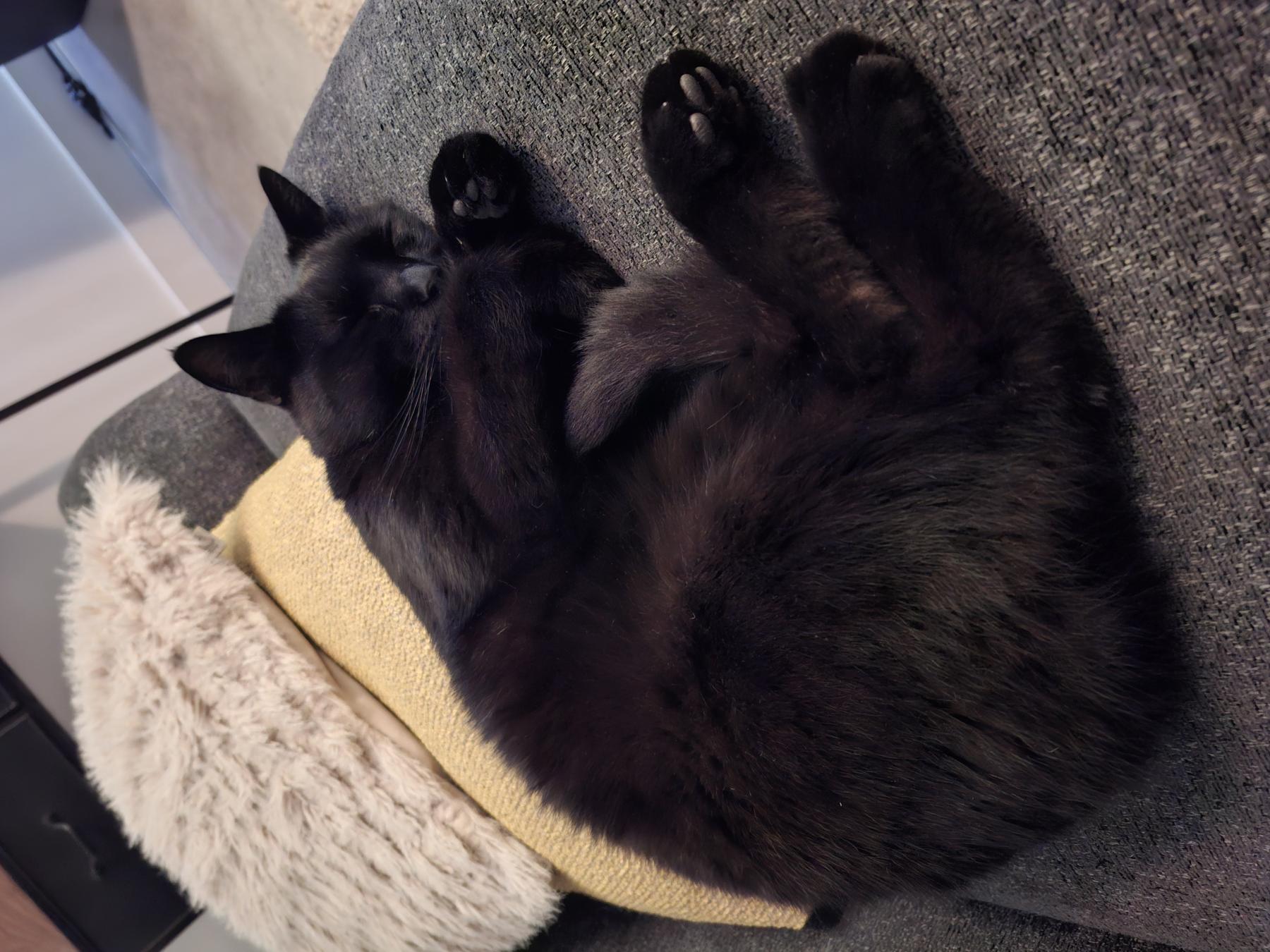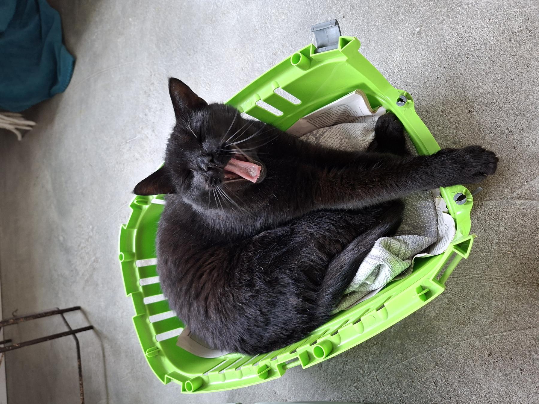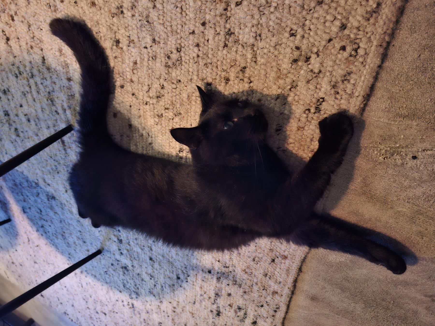 Rustig, lief en vriendelijk. Hij houdt nog van een beetje spelen of op een muis jagen. Slaapt graag in een doos of vierkante bak. Komt nieuwsgierig kijken naar wat je aan het doen bent in het huis of buiten in de tuin.