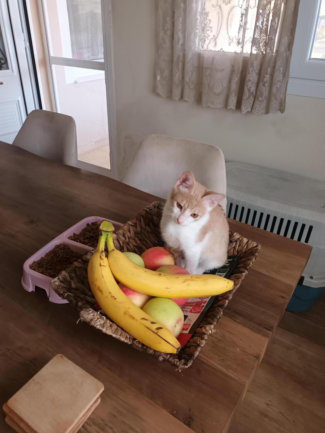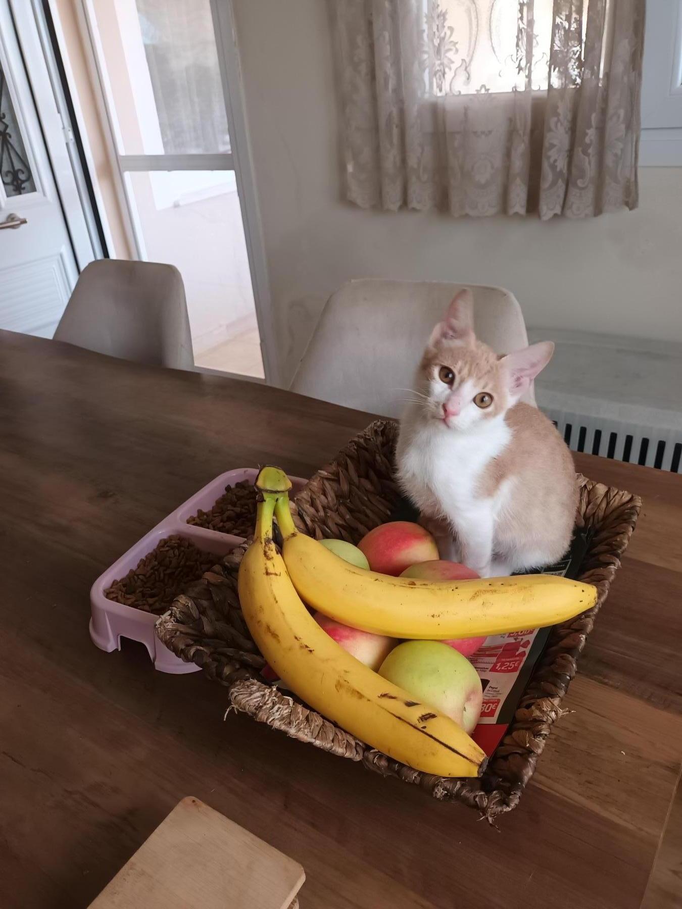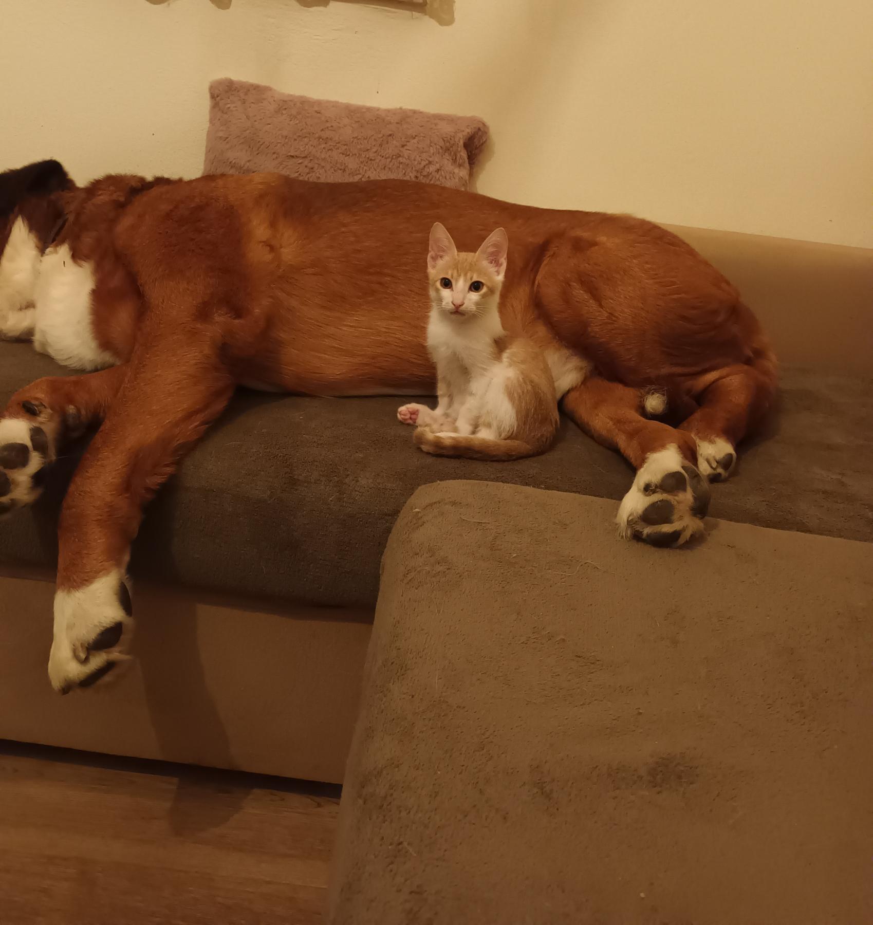 Hij groeit op met kittens, volwassen poezen en honden.