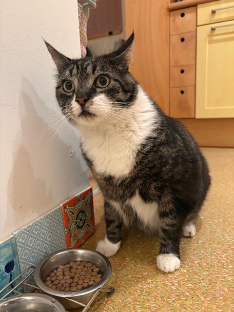 Ezeltje is een echte kat, doet z’n eigen ding. Is overdag veel buiten en heeft zijn eigen plekjes in de tuin. Hij komt door het kattenluik naar binnen voor zijn droge brokken.