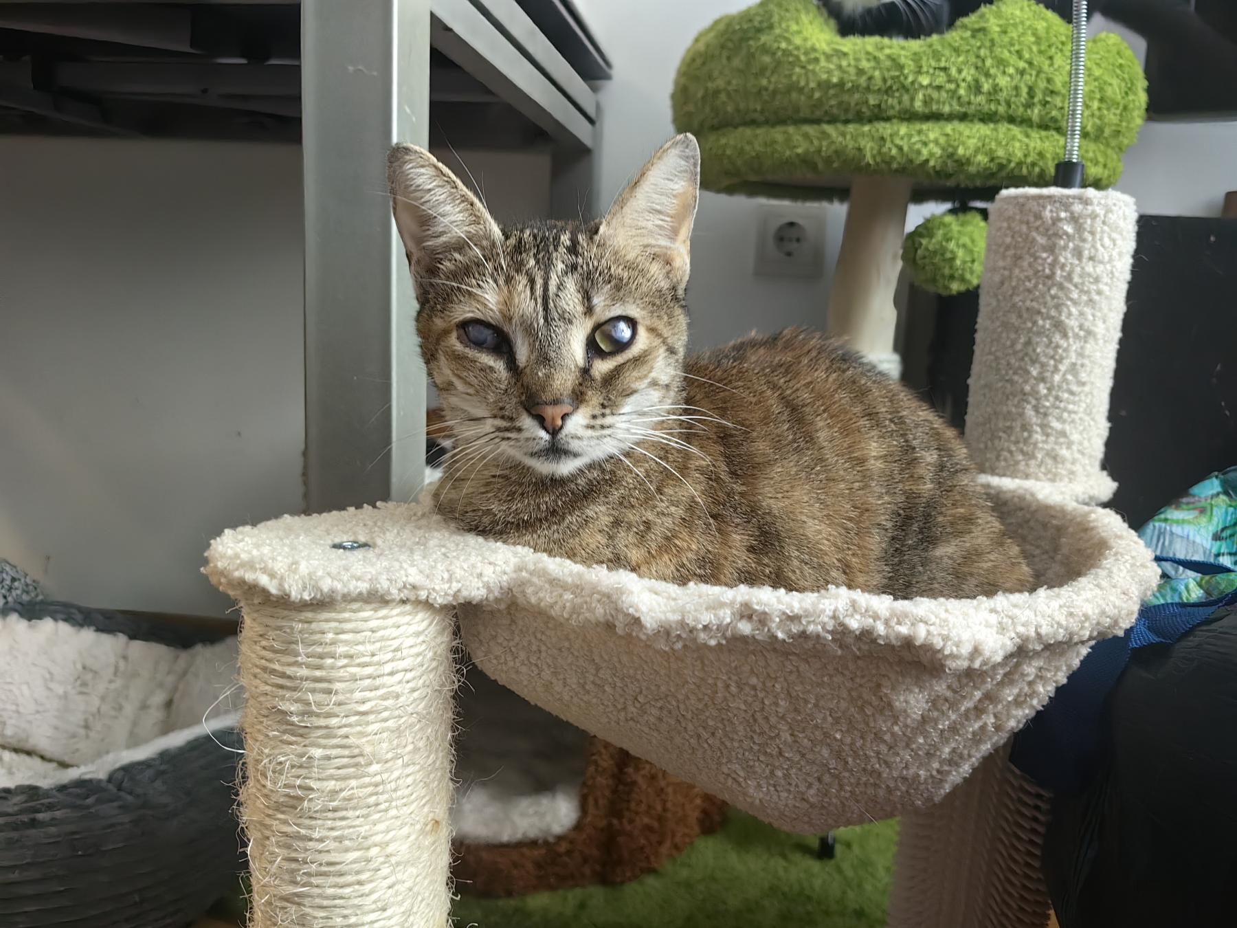 Luna is bijna volledig blind. Het is een heel speciaal meisje. Ze is aardig en heel knuffelig. Zodra je haar aanraakt gaat ze spinnen en met haar pootjes kneden. Luna vindt het heerlijk om met mensen te knuffelen