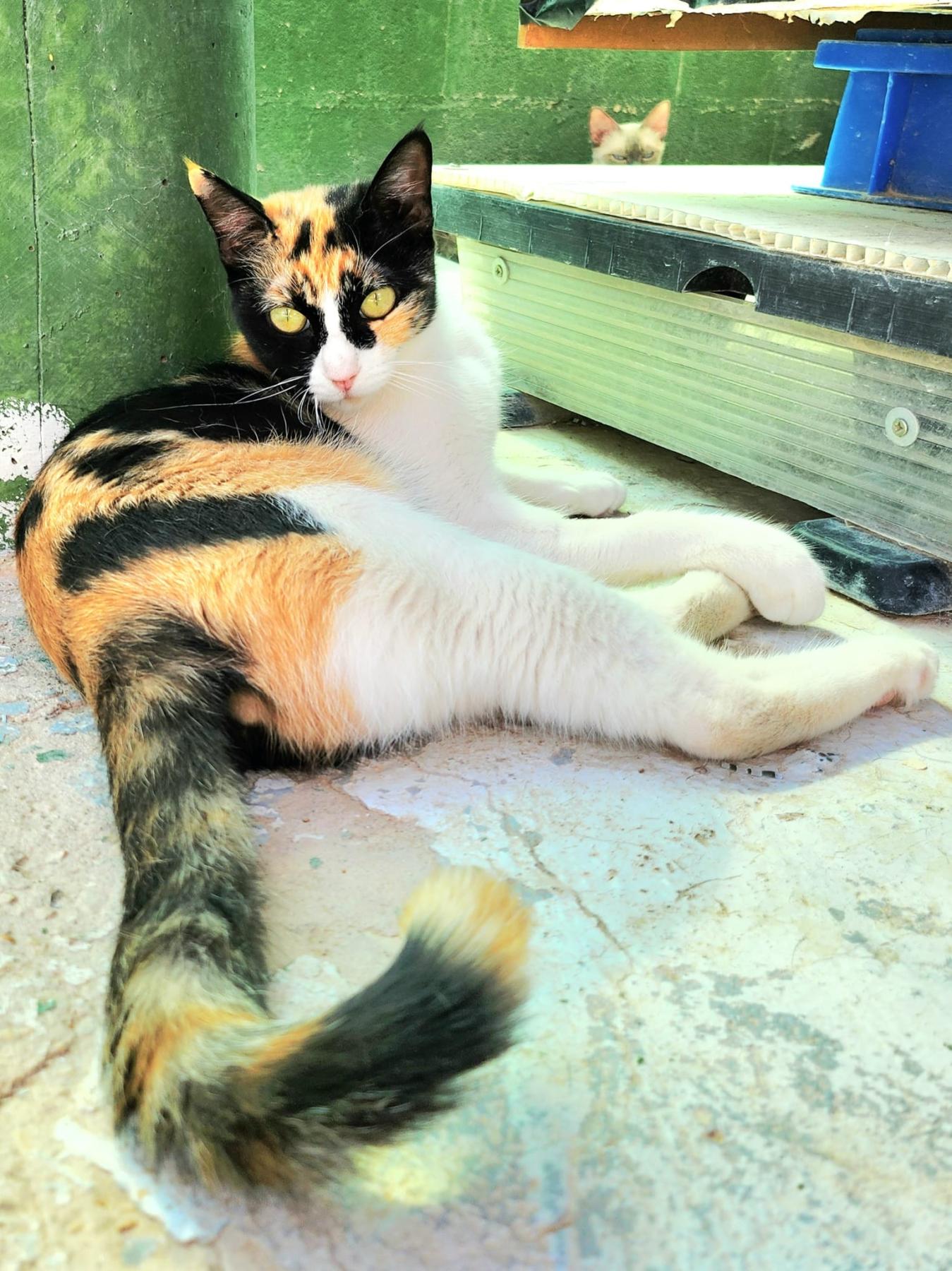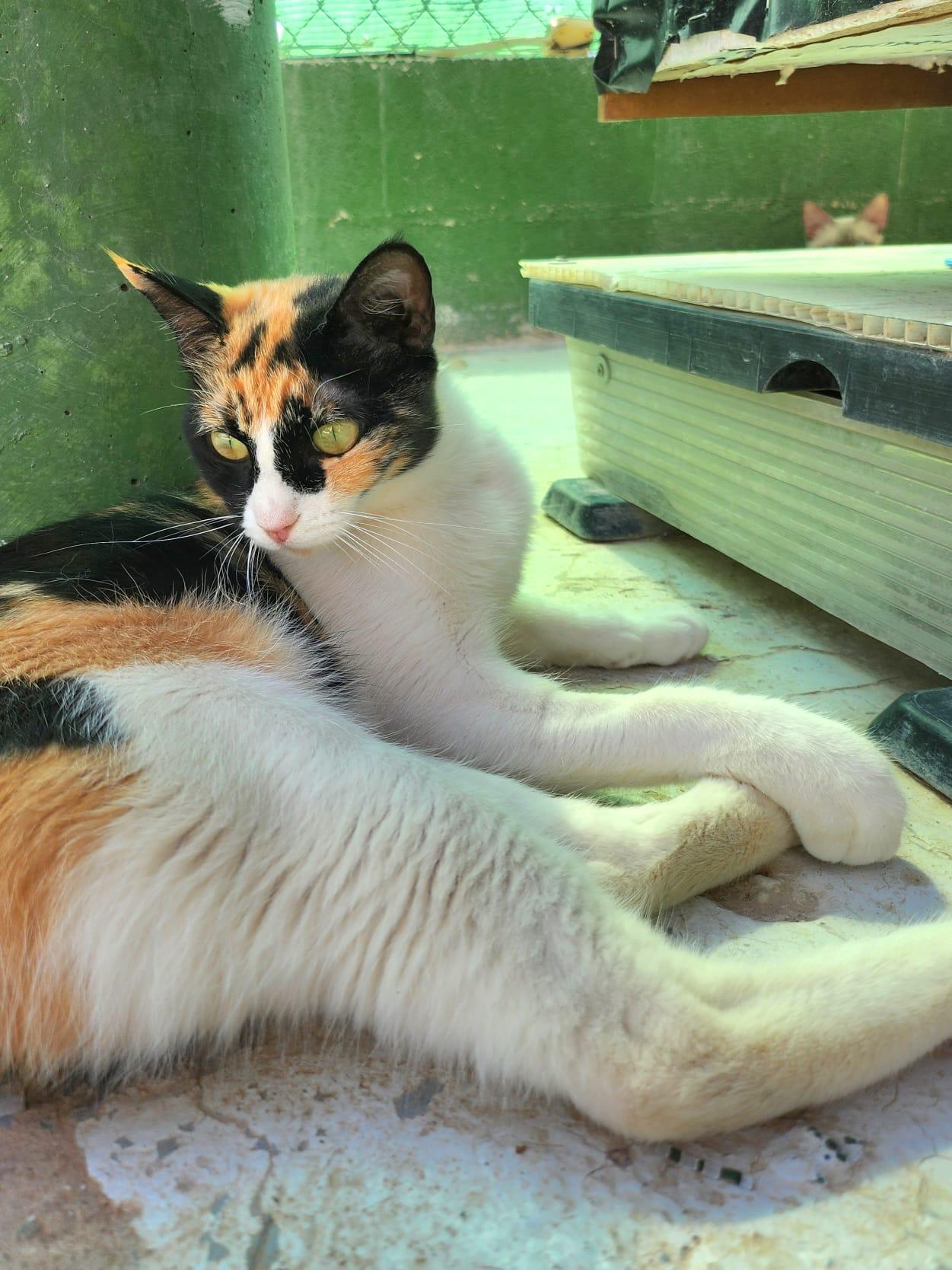 Macy woonde bij haar mens in huis, toen ze haar naar het asiel bracht vertelde ze dat Macy alleen, samen met haar in huis leefde, zonder andere katten om zich heen. Helaas moest haar mens terugkeren naar haar land en kon ze daar niet voor haar zorgen. Ze werd naar het asiel gebracht, daar logeert ze inmiddels in een groep. Daar wordt ze ongelukkig van. Ze was niet gevaccineerd of gecastreerd, dat is inmiddels in orde gemaakt. Ze was in goede gezondheid. Toen ze in de dierenkliniek werd gesteriliseerd, ontdekten ze dat ze zwanger was, wat betekende dat de eigenaar had gelogen. Ze had ofwel met andere katten samengeleefd of buiten contact met ze gehad. Daarmee is haar achtergrondinformatie niet betrouwbaar. Ze zal een nieuwe start moeten maken. Ze is een aanhankelijke, lieve poes, zonder afhankelijk te zijn. Ze is rustig en lief van karakter.