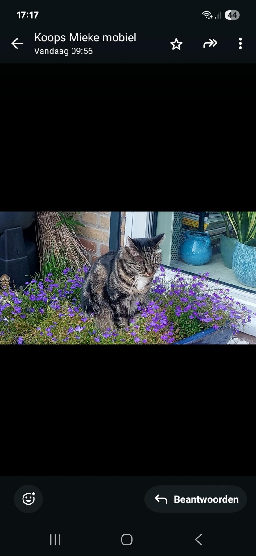 Lieve kleine poes. Aanhankelijk, zindelijk en gaat graag naar buiten maar is ook veel binnen. Ze is een hele mooie lieve poes. Komt graag bij je zitten maar liever niet op schoot. Wil graag geaaid worde